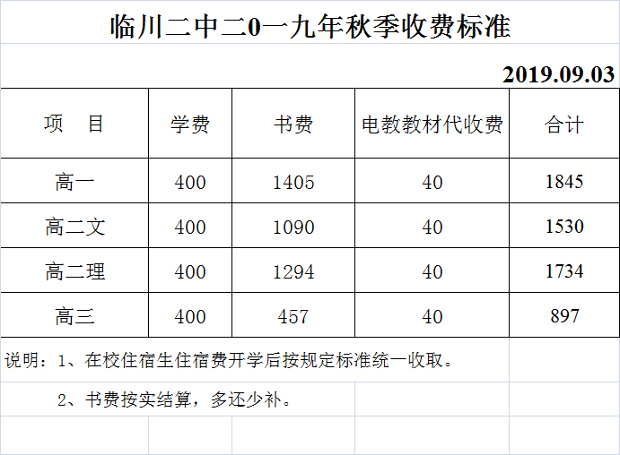 临川二中二0一九年秋季收费标准