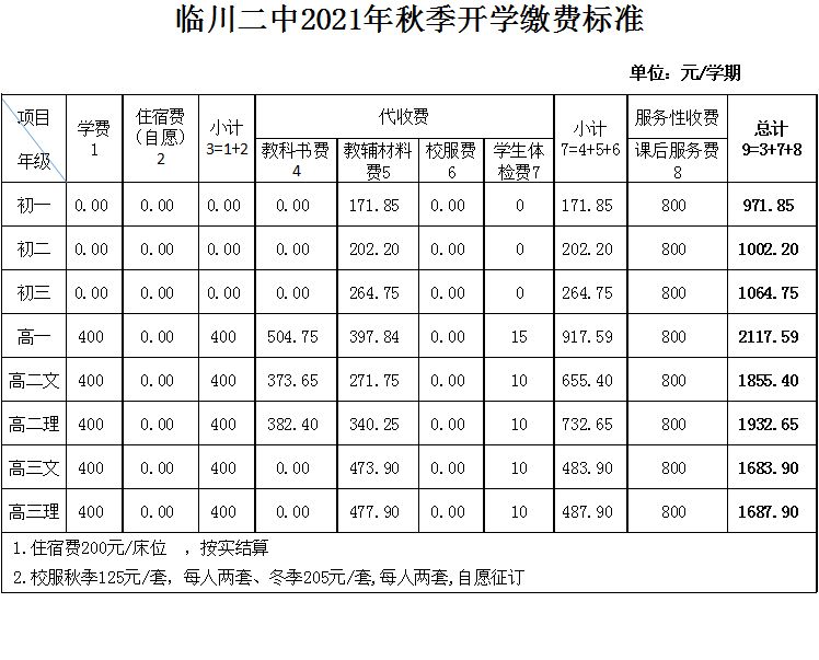 临川二中2021年秋季开学缴费标准