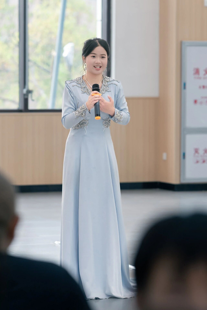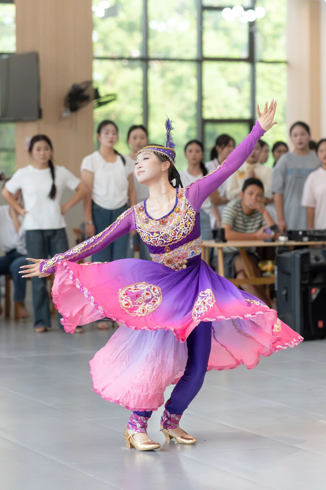 --萨克斯独奏《我和我的祖国》悠扬开场,随后音乐独唱《沂蒙山永远的爹娘》、集体朗诵《我和我的祖国》、国标舞《万疆》、中国舞《库玛拉》《维吾尔族舞》《藏族舞》等节目接连上演,最后以大合唱《走向复兴》高潮收尾。舞蹈的灵动、朗诵的深情、乐器的悠扬交相辉映,生动诠释了师生对美好生活的向往与对祖国的赤诚之心。